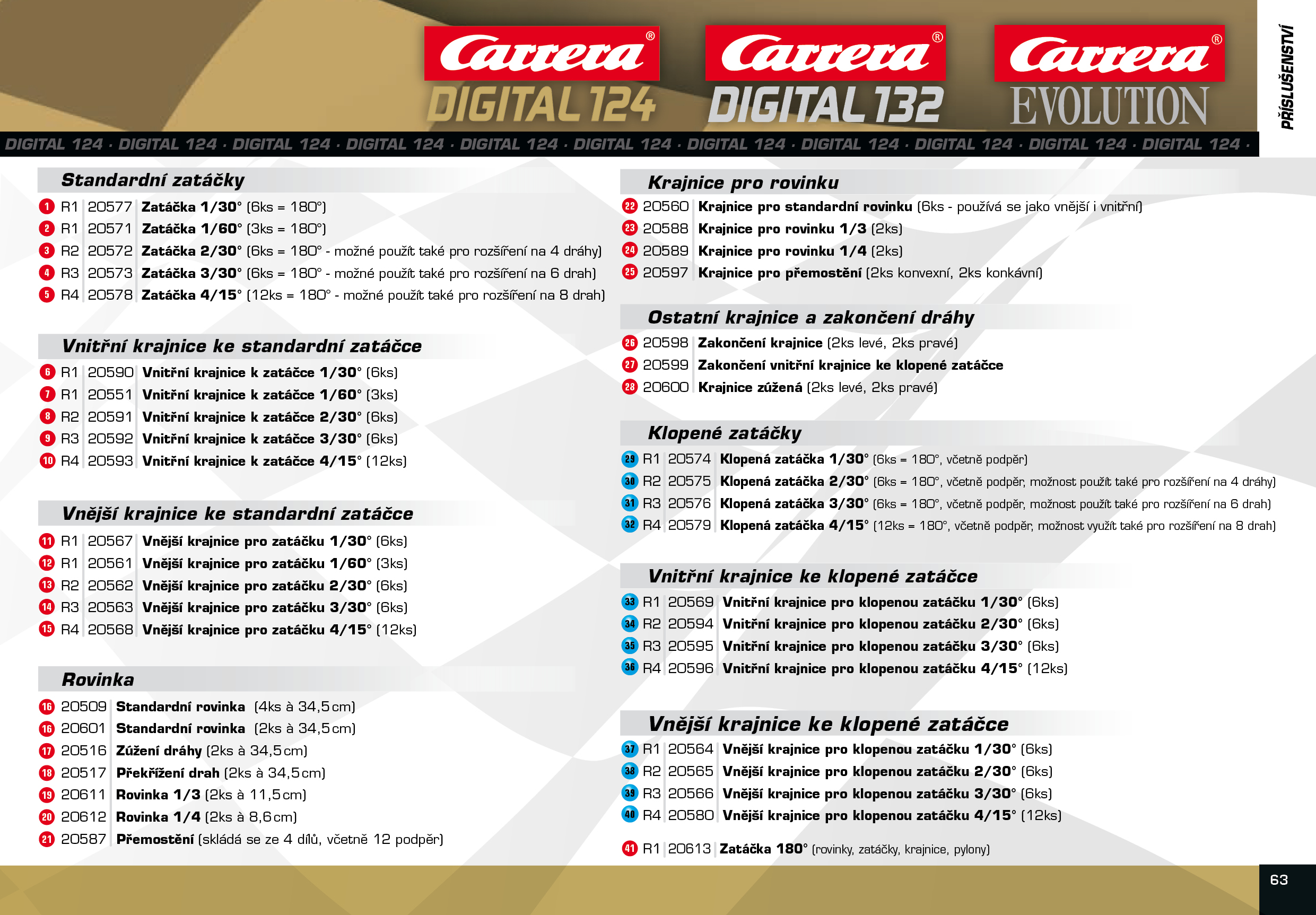 Vnější krajnice pro zatáčku 3/30° (20563) pro autodráhy EVOLUTION, Digital 132 a Digital 124. V balení je 6ks krajnic. Radius R3 (viz tabulka v záložce Soubory). K vnější krajnici pro zatáčku 3/30° (20563) jsou vhodné: Zatáčka 3/30° 20573