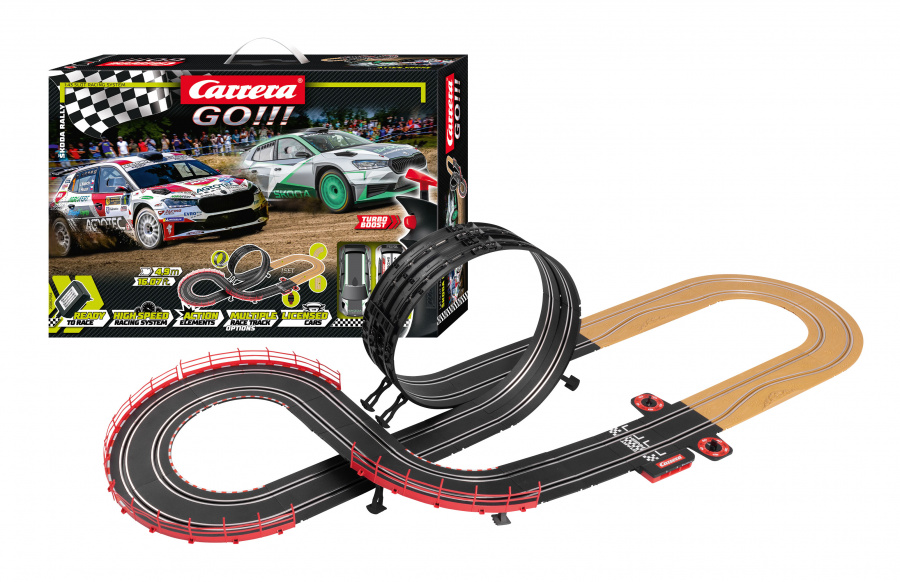 Autodráha Carrera GO!!! dlouhá 4,9m s auty Škoda FABIA RS 2 obsahuje looping, zúžení dráhy, přemostění, rally dráhu, rovinky, zatáčky, díl s počítadlem kol a další díly. Můžete si sestavit další různé trati podle své fantazie.