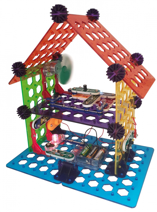 Se stavebnicí Boffin II Můj Dům se dozvíte, jak elektřina přichází do domů, sestavíte si světelné čidlo, elektrické topení, dvoupatrový dům, větrný mlýn a další projekty. Stavebnice obsahuje 60 součástek, z nichž lze postavit projekty: